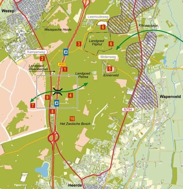 Het ecoduct nabij Heerde, een veilige oversteekplaats voor dieren, is onderdeel van het project Negen Ecoducten. Naast dit ecoduct worden er in de periode 2009-2012 nog acht ecoducten gerealiseerd. Vijf daarvan op de Veluwe, twee op de Utrechtse Heuvelrug en een op de Sallandse Heuvelrug. Het project vloeit voort uit het Meerjarenprogramma Ontsnippering (MJPO). Het MJPO is een landelijk initiatief van de ministeries van Verkeer en Waterstaat, VROM en LNV om de ecologische versnippering terug te dringen en de Ecologische Hoofdstructuur te verbeteren. Dat doen zij met maatregelen als ecoducten, faunatunnels en ecoduikers.