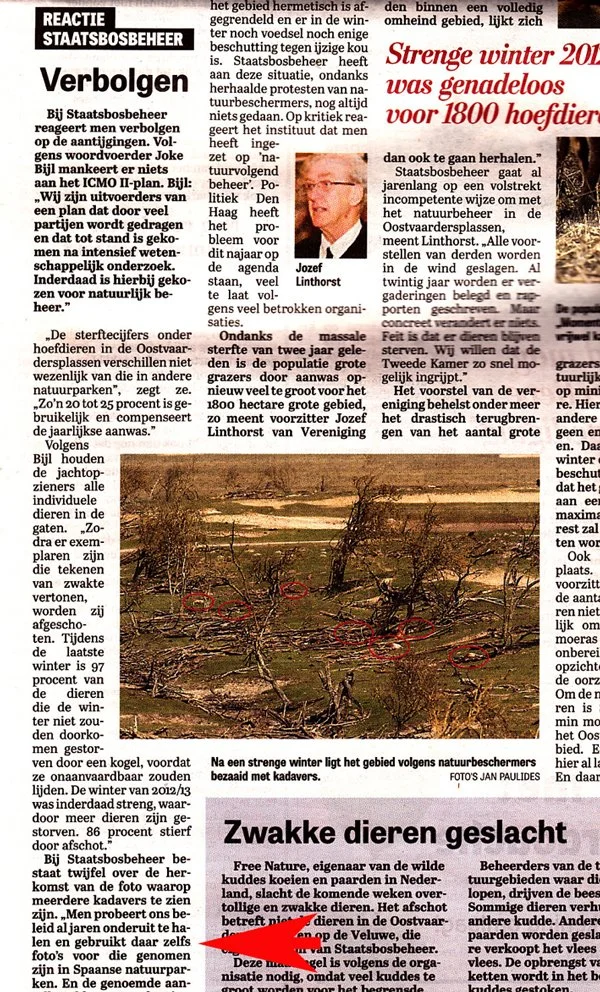 Staatsbosbeheer ontkent dat er vorig jaar veel kadavers te zien waren vanaf de Praambult, een van de uitkijkplaatsen van de Oostvaardersplassen. Daarmee wordt de realiteit ontkent. Zouden ze echt niet weten hoe erg het is in hun eigen terrein? Staan ze dan eigenlijk wel achter hun eigen beleid? In ieder geval is de politiek verantwoordelijk en vraagt Vereniging het Edelhert aan de Tweede Kamer om een andere opdracht te geven aan SBB. Hekken weg of reductie van de kuddes. En de Vereniging realiseert zich dat het voor 'hekken weg' veel te laat is.