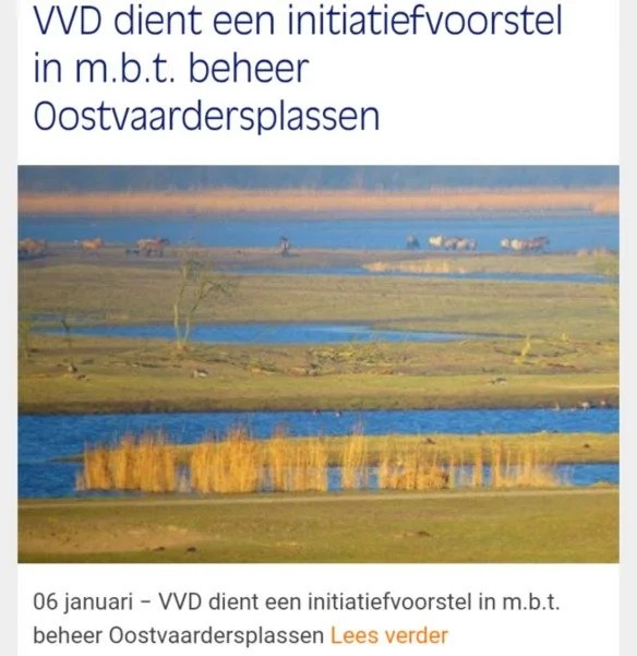 De fracties van VVD en SGP in de Staten van Flevoland hebben op vrijdag 6 januari een initiatiefvoorstel met betrekking tot beheer Oostvaardersplassen aan de Commissaris van de koning overhandigd. Het voorstel wordt door nog eens zeven partijen ondersteund. Voor een link naar de beide websites van de partijen klikt u op de foto.: