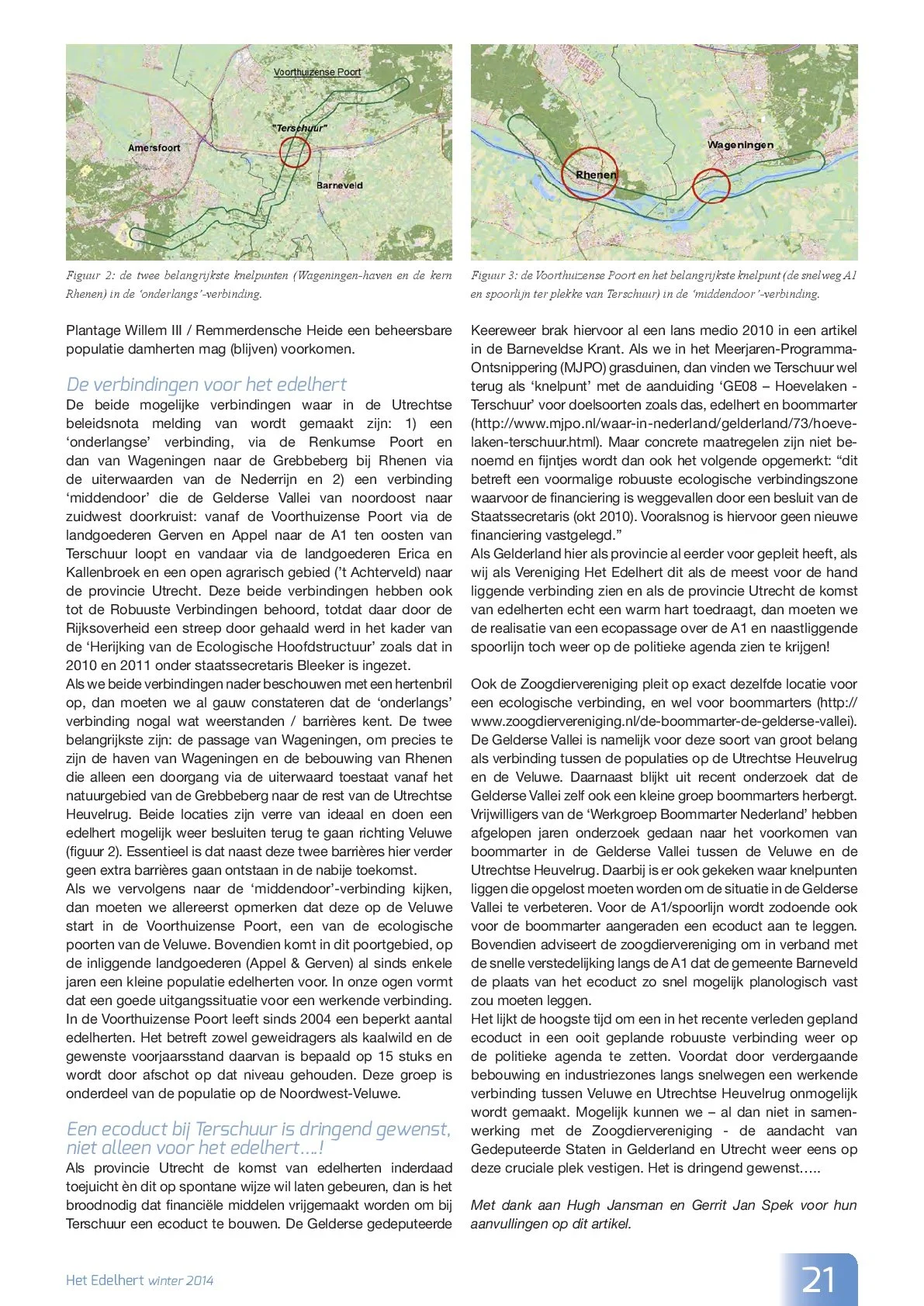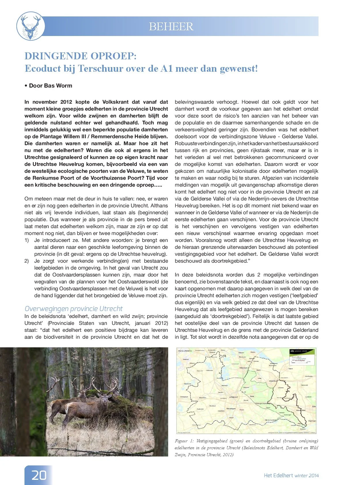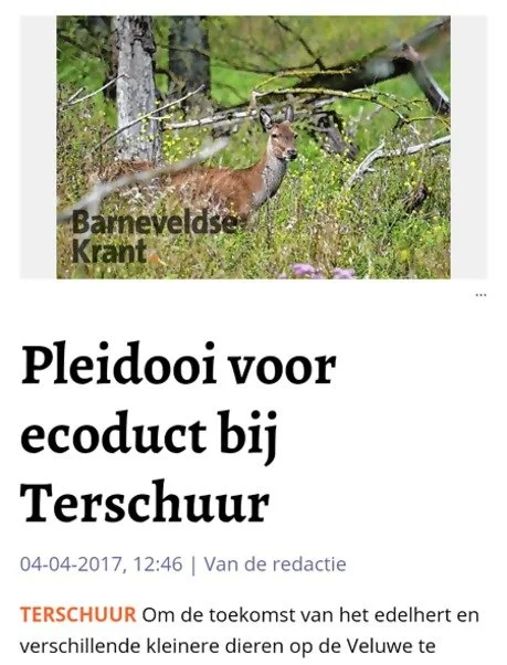 De Barneveldse Krant heeft op 4 april 2017 een artikel gewijd aan een wens van VhE van een te bouwen ecoduct bij Terschuur. In het winternummer van Het Edelhert 2014 schreef Bas Worm het artikel: 'DRINGENDE OPROEP: Ecoduct bij Terschuur over de A1 meer dan gewenst!' De Barneveldse Krant heeft onlangs een artikel over geschreven, hiervoor is voorzitter Linthorst geinterviewd. Ook De Amersfoortse Courant en Omroep Amersfoort besteedden er daarna aandacht aan. Linthorst meent dat het belangrijk is om er haast mee te maken, want zoals hij zegt: "Nu kan het nog, als er straks een schuur staat of een grote stal dan kan het niet meer." Hierbij een afdruk van de kop van het artikel, deze afdruk is tevens de link naar het artikel op de site van de Barneveldse Krant.