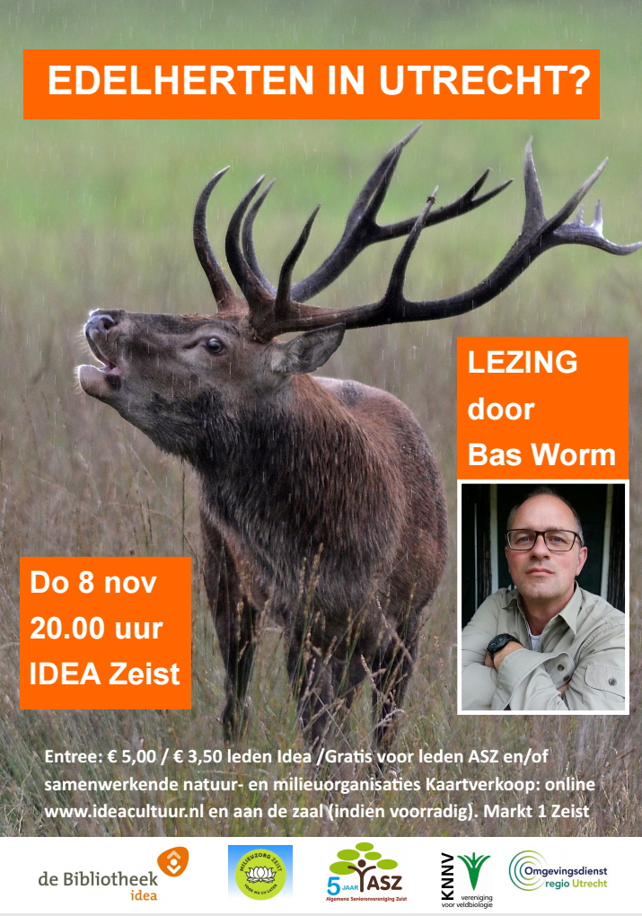 Ons bestuurslid Bas Worm zal op donderdag 8 november a.s. in Zeist bij de bibliotheek (Markt 1.) een lezing houden over edelherten in Nederland en de mogelijke rentree in de provincie Utrecht.