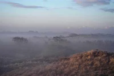 Het landschap doet onwerkelijk aan door de mist,