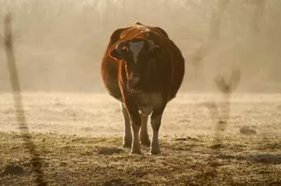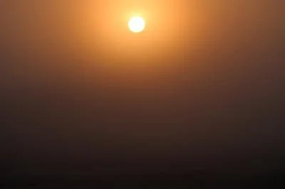 De ochtendzon en de mist doen de scheiding tussen land en lucht verdwijnen.