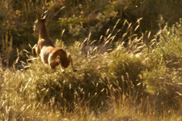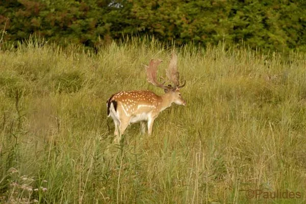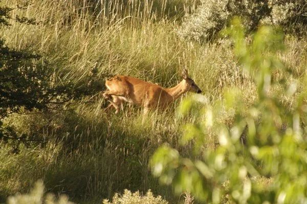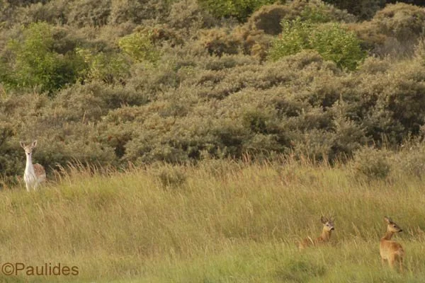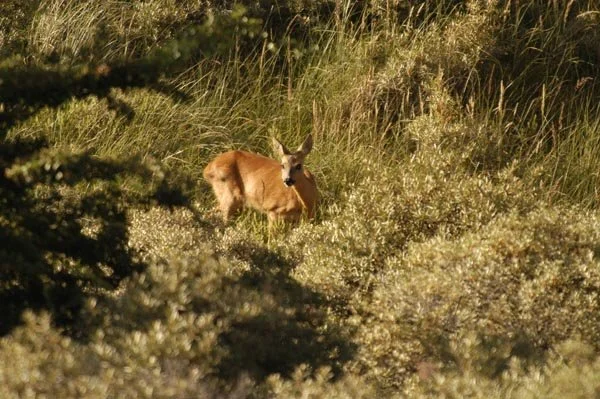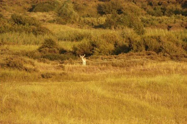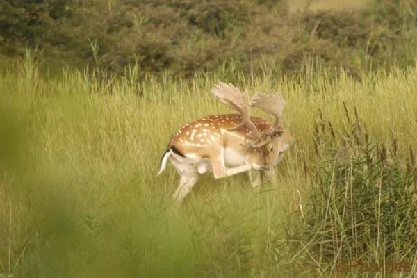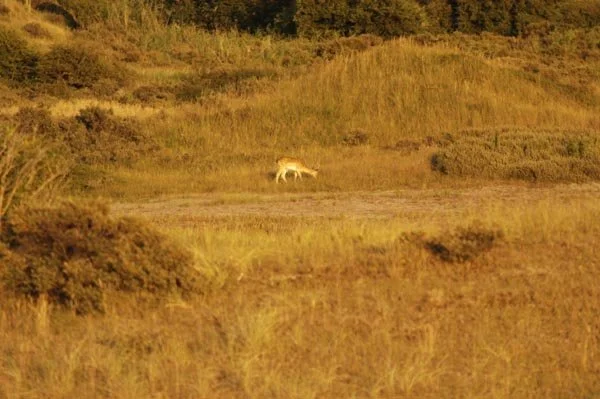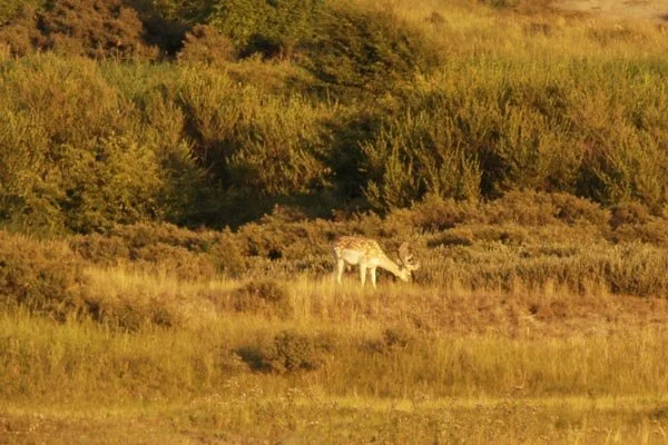 Hier in een duinpan een circa. 4-jarige damhert in de avondzon te laveien. Het eerste damhert dat de zeereep overgestoken en het strand opgelopen is, is reeds gesignaleerd. Het verschil in biotoop en het effect op het damhert werd meteen duidelijk. De duinen zijn erg mineraal rijk, de Veluwe mineraal arm. Het verschil in biotoop en het effect op het damhert werd meteen duidelijk. De duinen zijn erg mineraal rijk, de Veluwe mineraal arm. De opbouw van het gewei verloopt in de duinen dan ook aanzienlijk sneller. Het Kniepfer gewei komt niet voor, dit 'stadium' wordt overgeslagen. Damherten ontwikkelen hier reeds op jongere leeftijd dan de 5 - 6 jaar op de Veluwe een Schaufler gewei. Na de bronst zijn de damherten, die hier in een hogere dichtheid leven dan op de Veluwe, bijzonder onverdraagzaam. Als de paar hindes die niet beslagen zijn, opnieuw bronstig worden, proberen de jongere herten hen te beslaan. De oude herten willen echter meedoen, maar krijgen op hun donder van de jonge hertjes. Ieder jaar worden er in de duinen dan ook zo'n 7-8 damherten geforkeld.