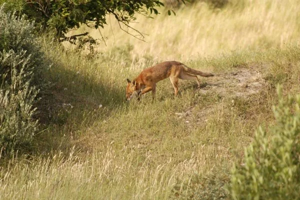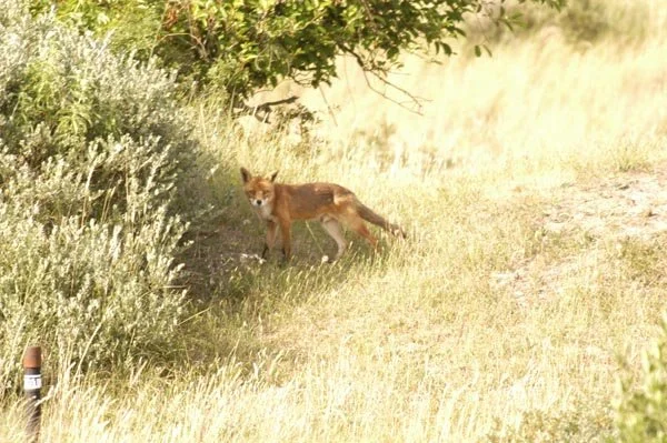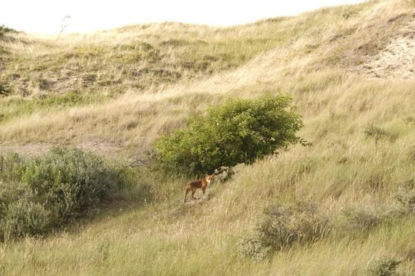 Uit een del loopt dezelfde vos de duin top op.