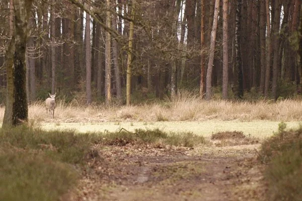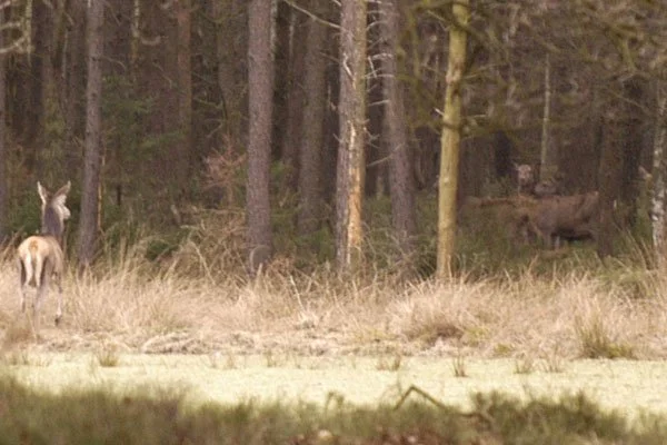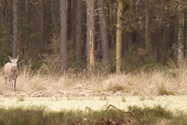 Van nature zijn de herten dagdieren. Omdat overdag het onrustig is door wandelaars en fietsers zijn de herten steeds meer 's nachts actief. Dat wil niet zeggen, dat ze overdag niet meer te zien zijn. Je moet wel goed kijken en heel rustig en stil zijn. Pak de verrekijker en kijk heel stil even met mij mee. Daar in de verte staat een hinde op het weitje. Goed te zien, nietwaar? Jammer dat er niet meer herten staan. Of zijn er wel meer te zien? Kijk goed.