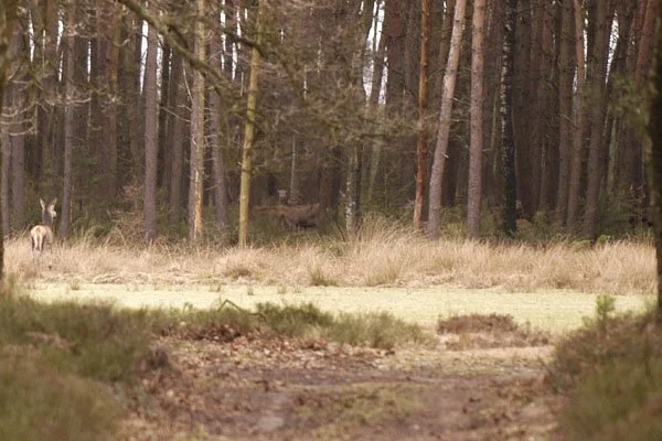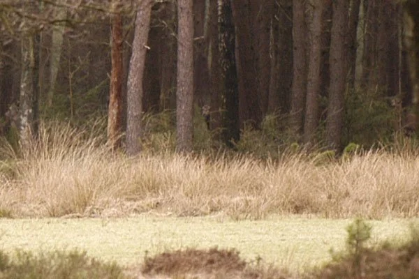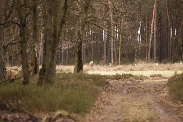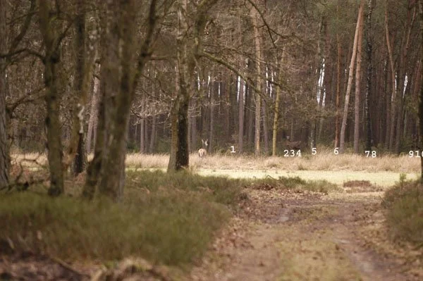 Het volgende is hier aan de hand. Een hinde komt het weitje opgelopen. Op de foto is het niet zo goed te zien, maar de hinde is zeer alert. Hieruit rijst het vermoeden, dat we hier met een leidhinde te maken kunnen hebben. Ze kijkt de hele omgeving af. Loopt wat heen en weer en blijft dan weer staan. Ik zei al 'leidhinde'. Dit is een hinde met een kalf (kalf is nog geen jaar) en meestal ook een smaldier (een kalf tussen 1 en 2 jaar). En een goede moeder als zij is, let zij goed op wat er kan gebeuren met haar kalf (en in dit geval ook de rest van de roedel). Zij verkent de omgeving en als alles veilig is, mag de roedel tevoorschijn komen. De roedel staat nu nog in de dekking. Achter de bomen verscholen, kijk nog maar eens. Eerst goed zoeken en dan pas naar de volgende foto's. Anders is de lol eraf!