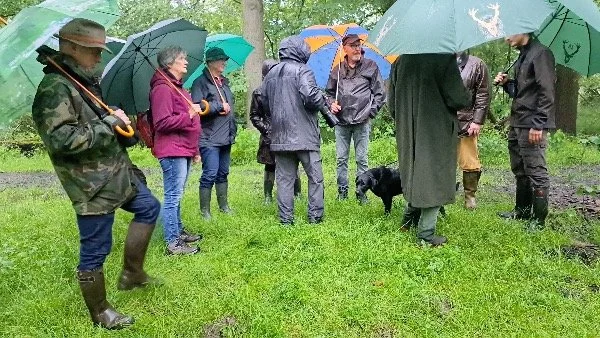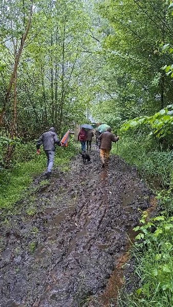 De wandeling loopt over modderige wegen en glibberige paden. De laarzen zijn beslist niet overbodig. Soms moet er steun gezocht worden bij elkaar en dan ook nog met de paraplu op.