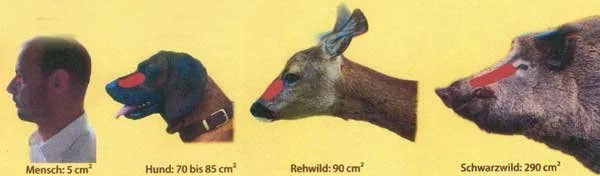Ter vergelijking: het reukslijmvlies van een volwassen mens omvat ongeveer 5 cm2, die van een niet al te kleine hond tussen 70 en 80 cm2.